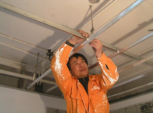 2、收邊條粘好后,再確定在天花上打孔的位置,首先要確定的是鋁梁安裝的位置,盡可能讓兩邊的距離相等。根據(jù)鋁梁的長(zhǎng)短確定打孔的多少(一般4個(gè)孔)。然后再確定邊上主龍骨的安裝位置。待孔打好后,根據(jù)安裝的吊頂高度,再截取絲桿,一般是從天花板到吊頂?shù)母叨葴p去六公分。
